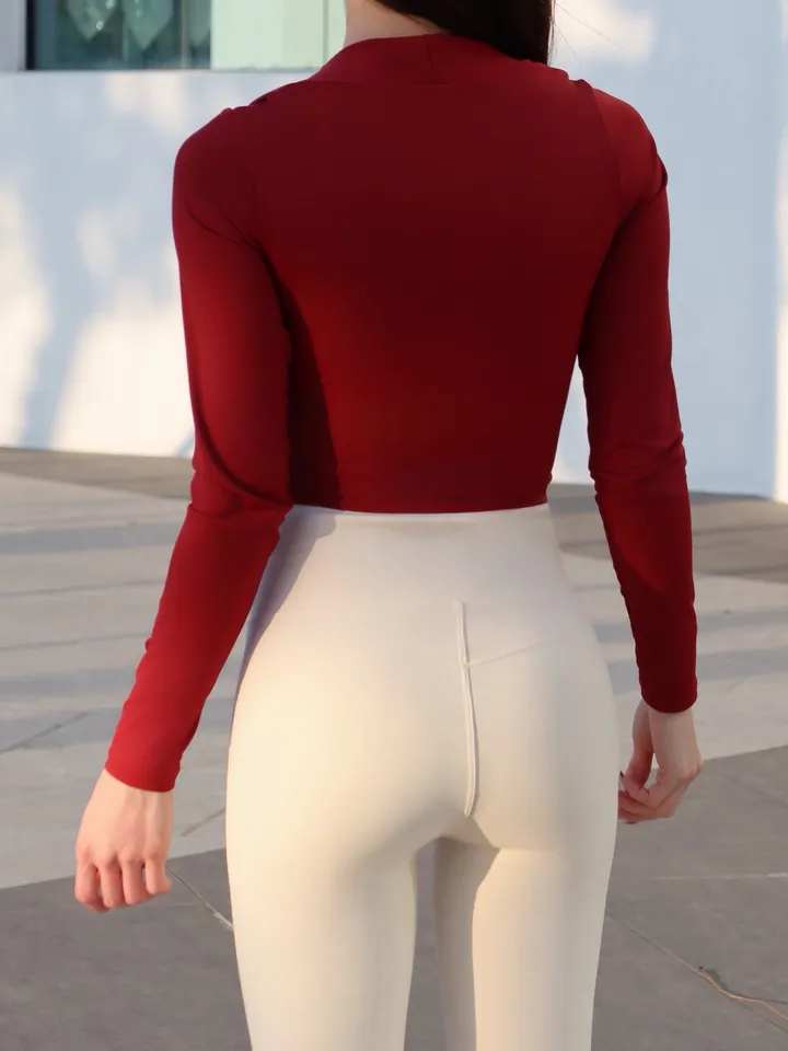 以酒紅色交叉抓皺上衣為設計亮點,