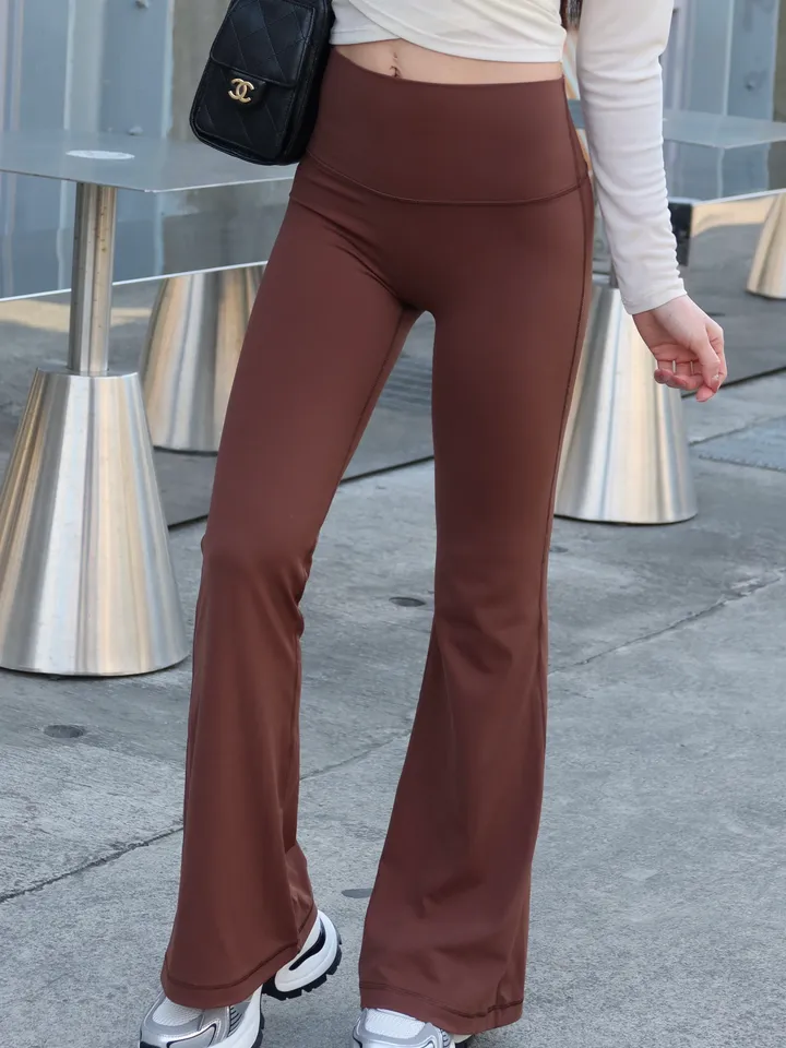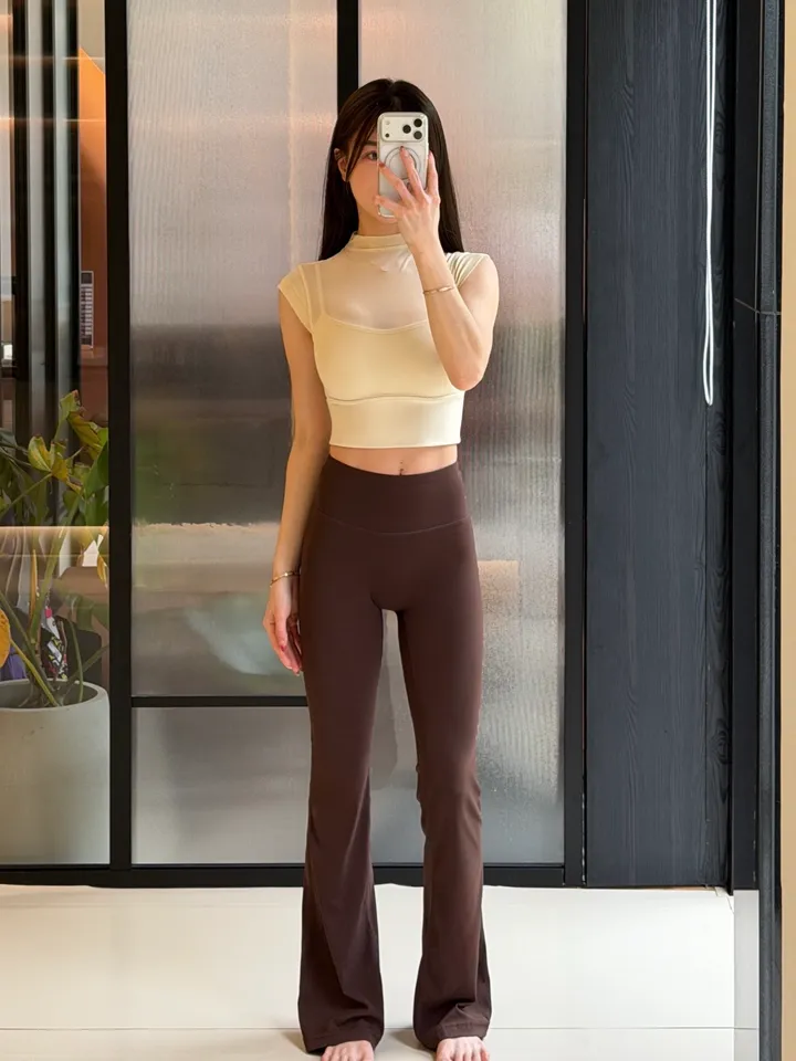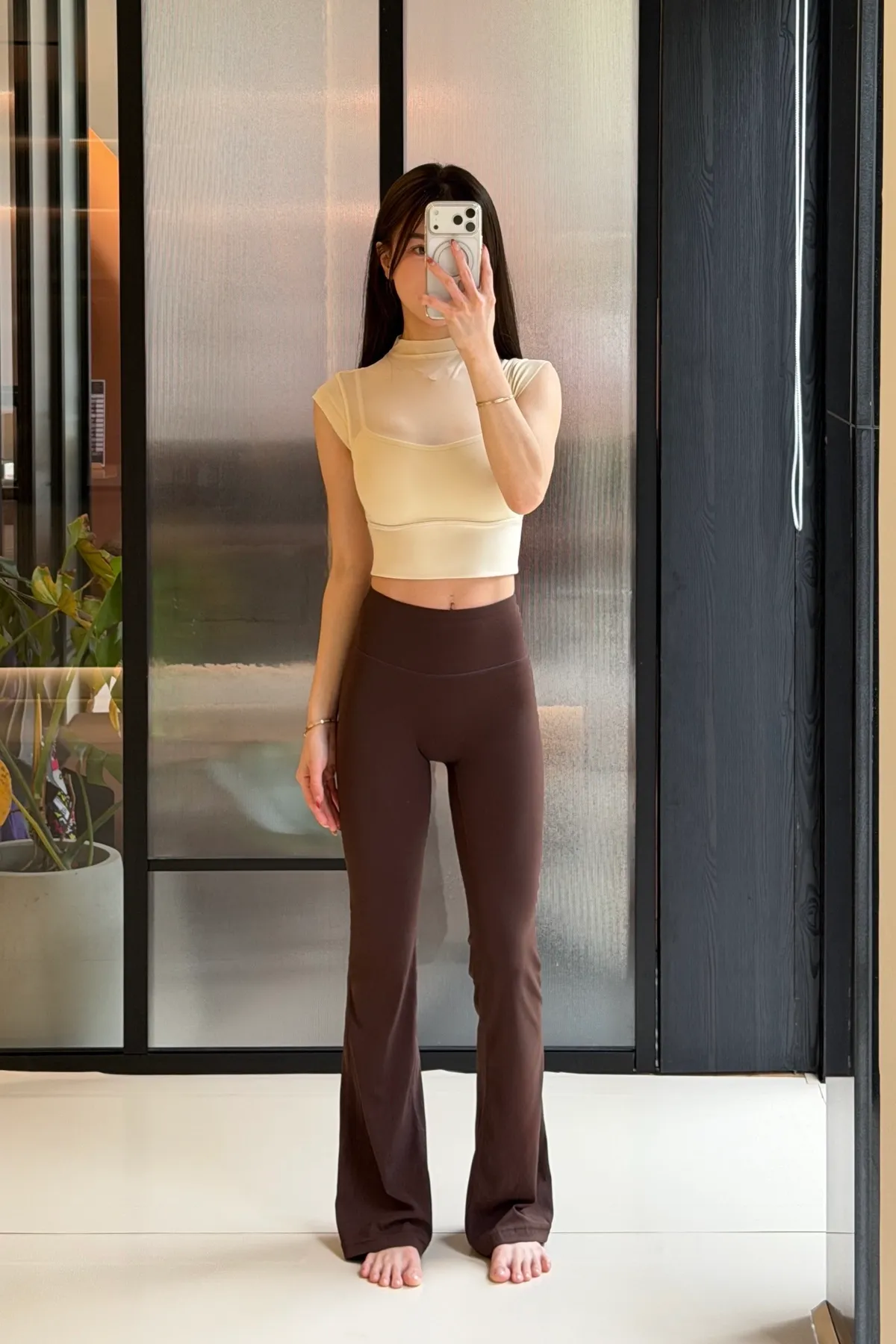 以奶霧網紗上衣搭配可可色微喇叭褲,