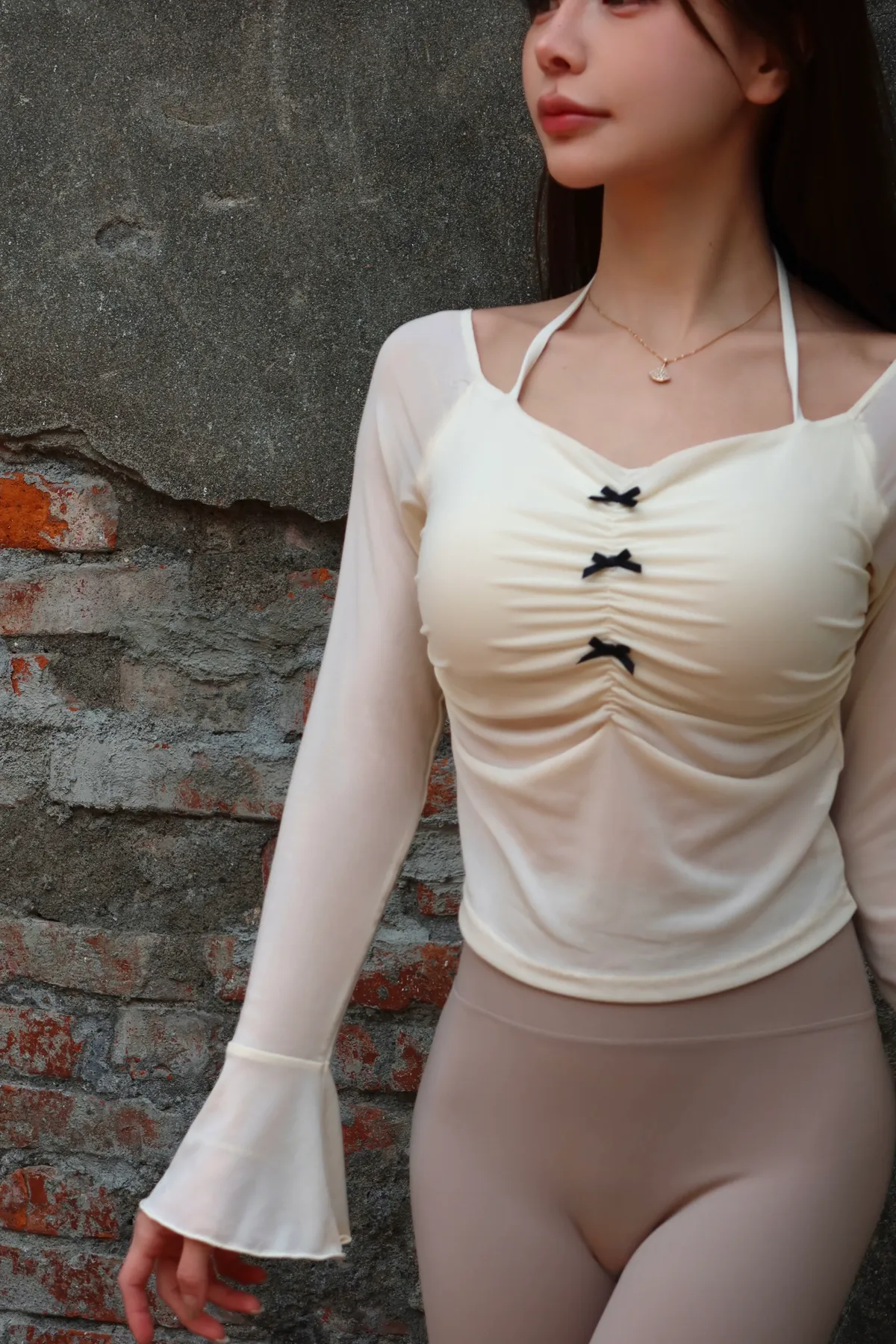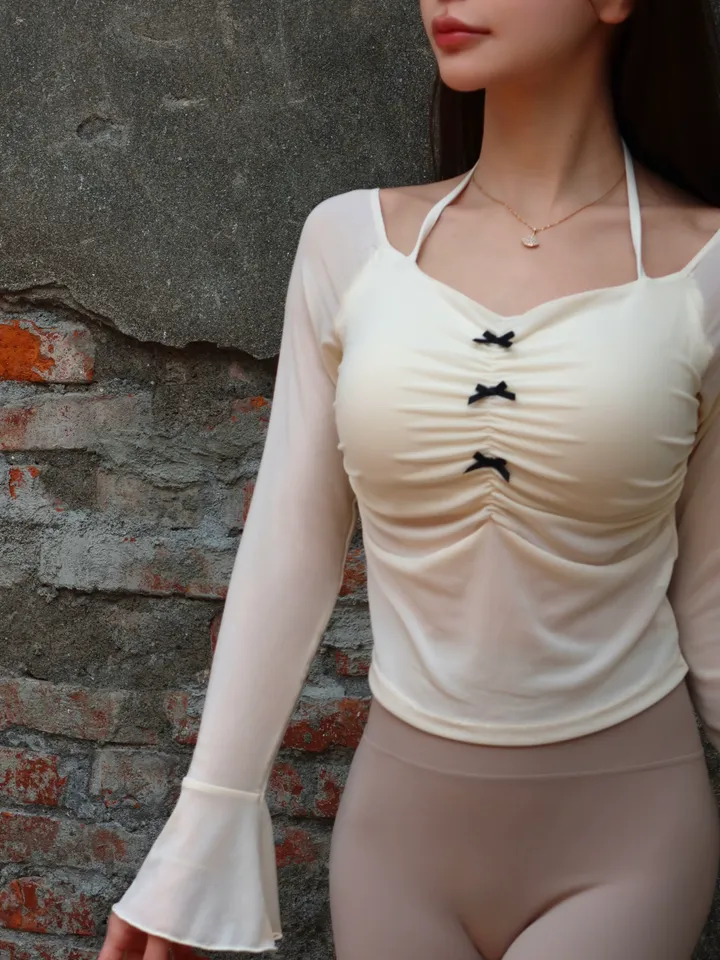 柔紗材質搭配胸前抓皺與蝴蝶結細節,